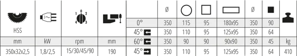 - HSS blade Ø 350x32x2.5 for solids or sections.
