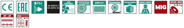 Three-phase industrial MIG welding units on wheels, equipped with 4 rolls separate wire feeder. They are all equipped with 5m interconnecting cable, euro connection torch, pressure regulator, gas hose, ground cable and clamp. They are equipped with timer for spot welding and with welding current and arc voltage displays. These professional units are fitted with manual (2T) and automatic (4T) welding selector, slope up ramp and burn back time adjustment feature. Well suited for medium sized industrial welding workshop. The reel holder will accept spools from 5 to 15 Kg.